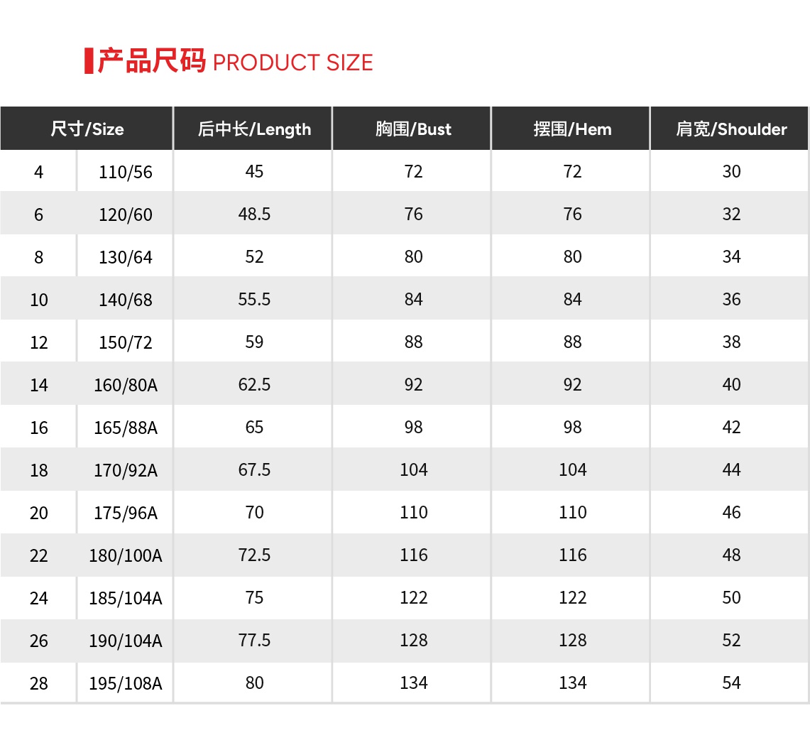 Size 110 or 120 or 130 or 140 or 150 or 160 or 165 or 170 or 175 or 180 or 185 or 190 or 195