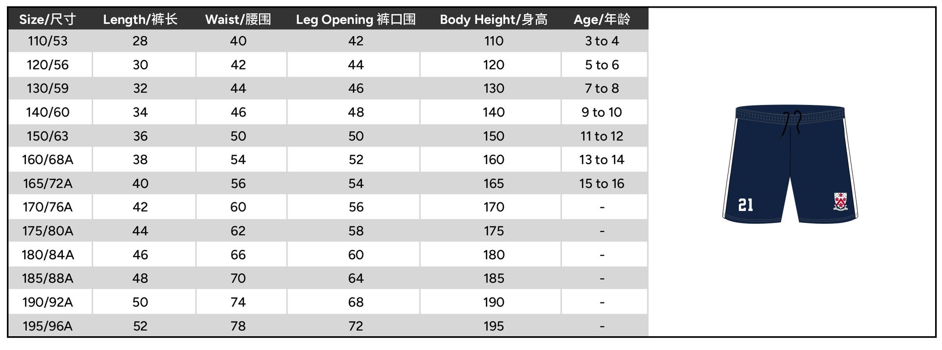 Size 110 or 120 or 130 or 140 or 150 or 160 or 165 or 170 or 175 or 180 or 185 or 190 or 195