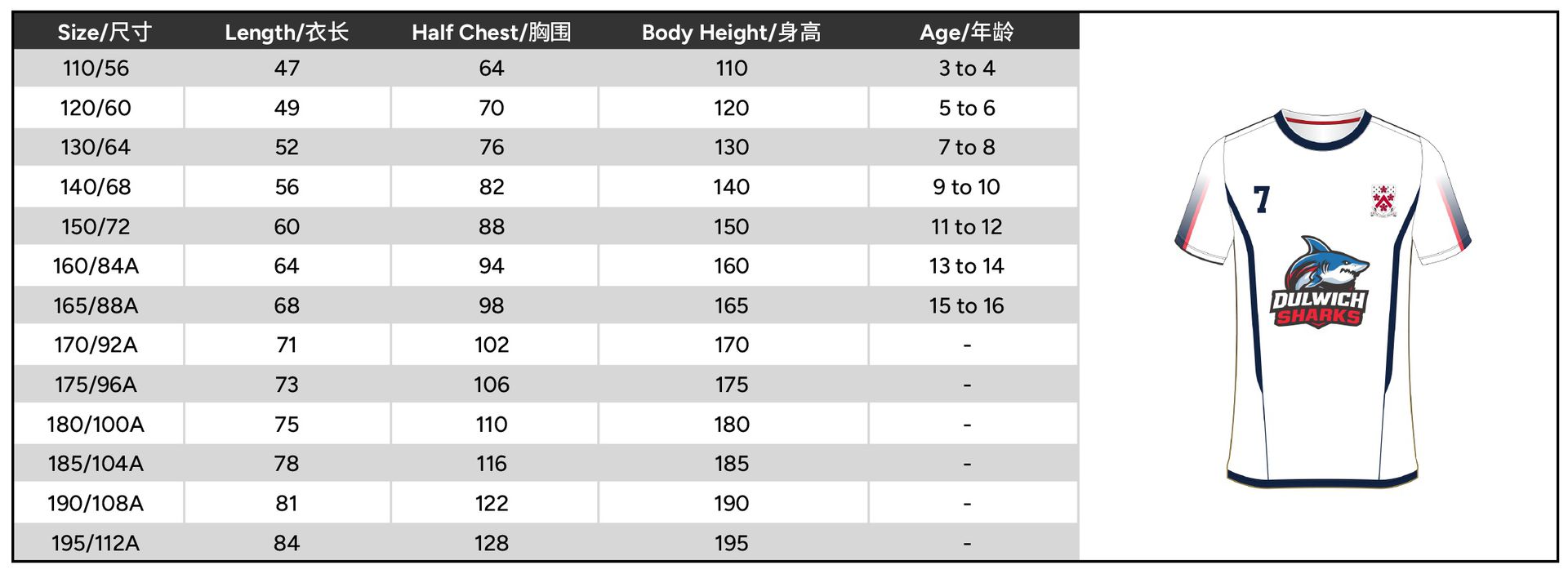 Size 110 or 120 or 130 or 140 or 150 or 160 or 165 or 170 or 175 or 180 or 185 or 190 or 195
