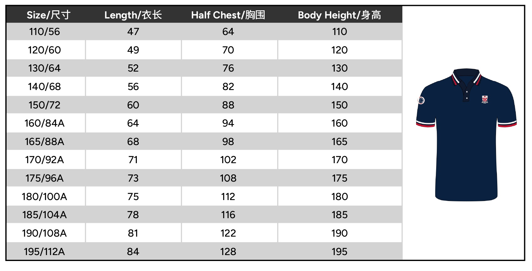 | Size | 110 or 120 or 130 or 140 or 150 or 160 or 165 or 170 or 175 or 180 or 185 or 190 or 195 |