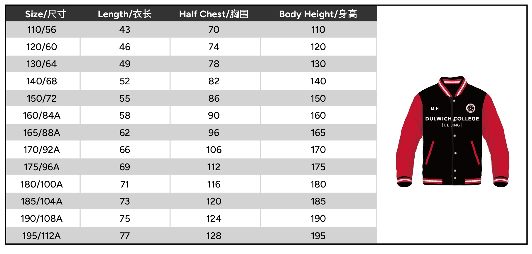 | Size | 110 or 120 or 130 or 140 or 150 or 160 or 165 or 170 or 175 or 180 or 185 or 190 or 195 |