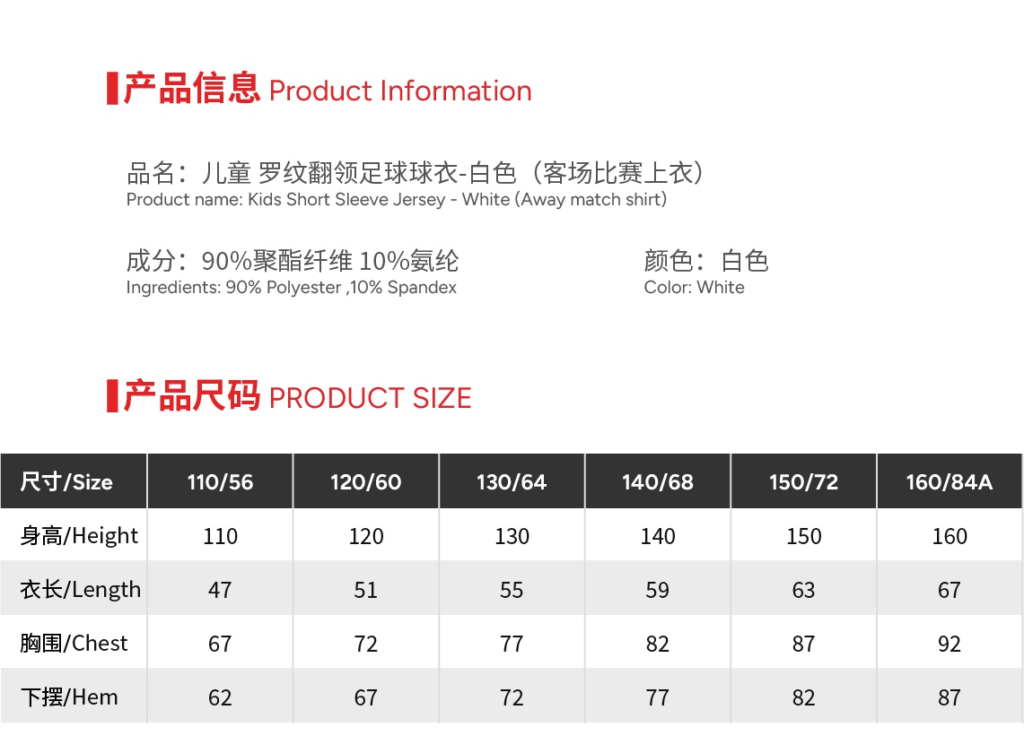 儿童 罗纹翻领足球球衣-白色(客场比赛上衣)